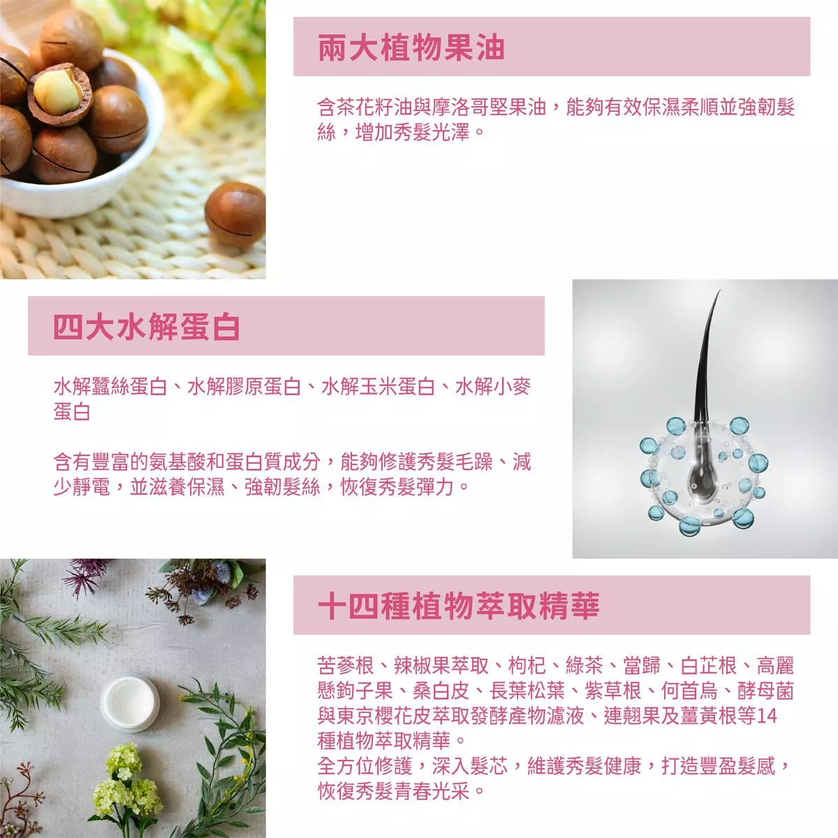 十四種植物萃取精華滋養並強韌髮絲、打造豐盈髮感,恢復秀髮青春光采