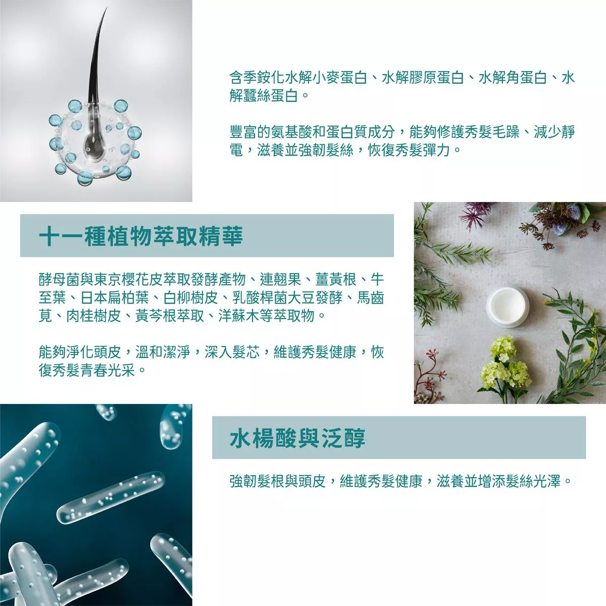 十一種植物萃取精華滋養並強韌髮絲,淨化頭皮,溫和潔淨,維護秀髮健康