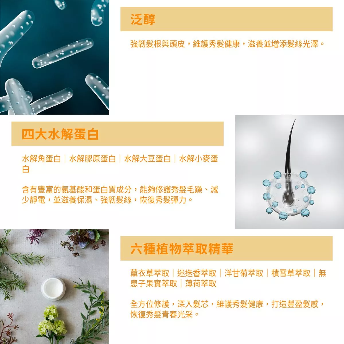 含泛醇,強韌髮根,維護秀髮健康,滋養並增添髮絲光澤
