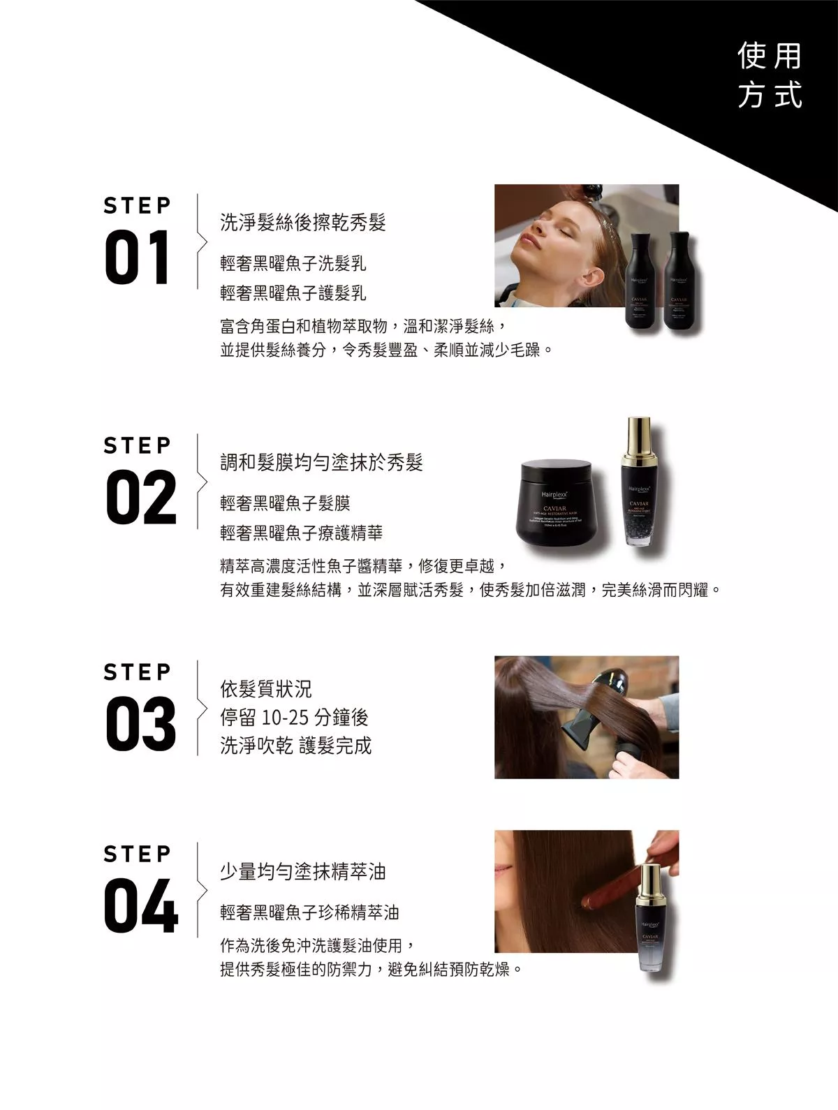 含有必需脂肪酸和豐富維生素,可防止頭髮乾燥和失去彈性, 修復秀髮並給予防禦。