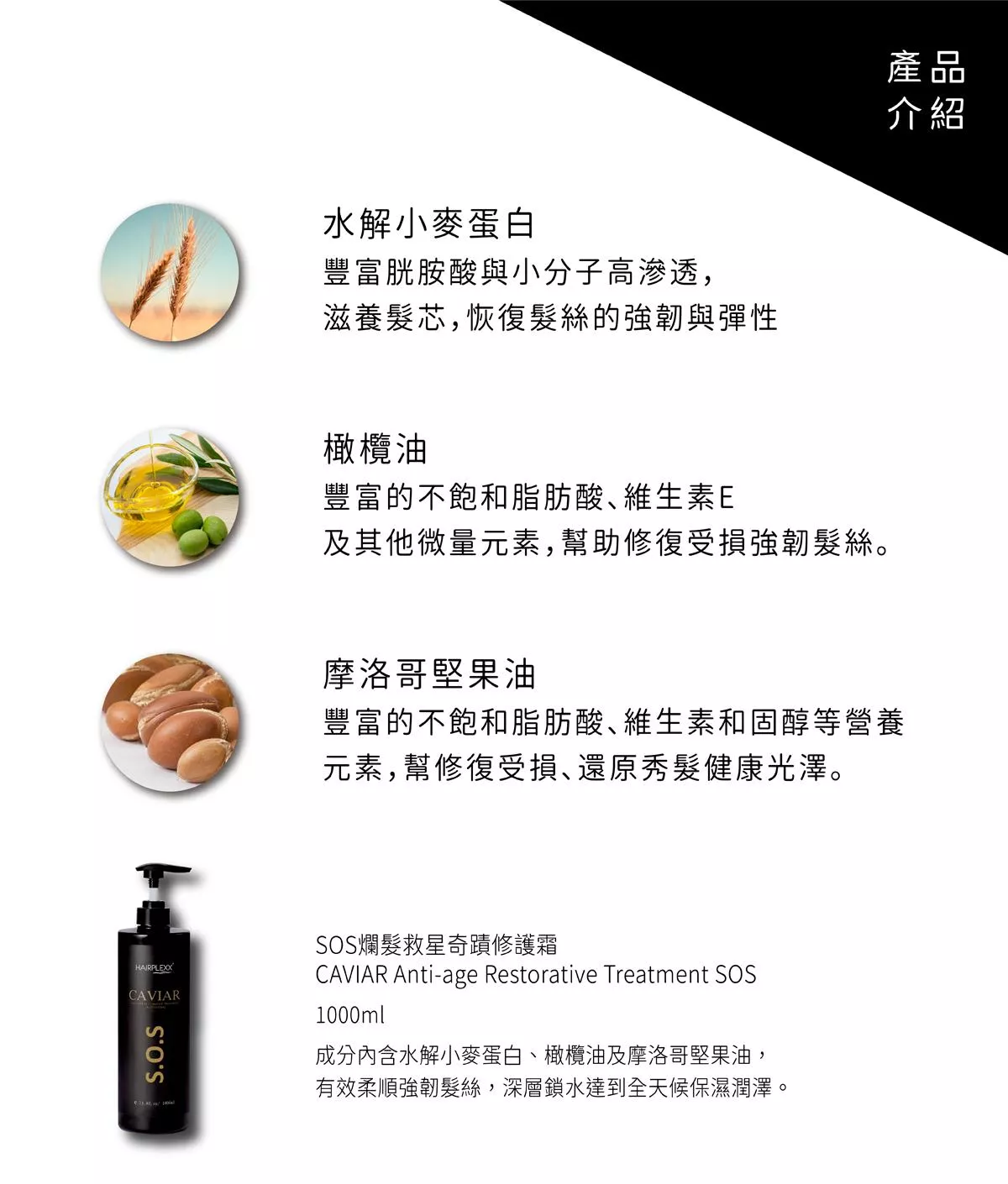 成分內含水解小麥蛋白,幫助修護毛髮,高效保濕並強韌髮絲。