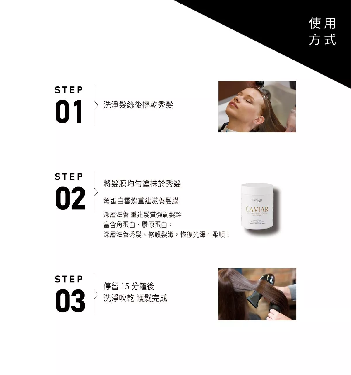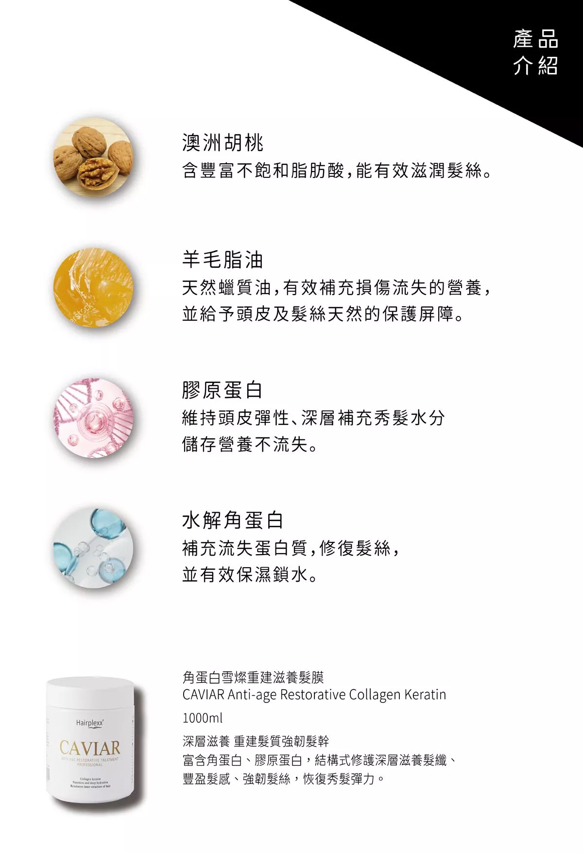 富含膠原蛋白、角蛋白,深層滋養秀髮,修護髮纖,恢復光澤、柔順!
